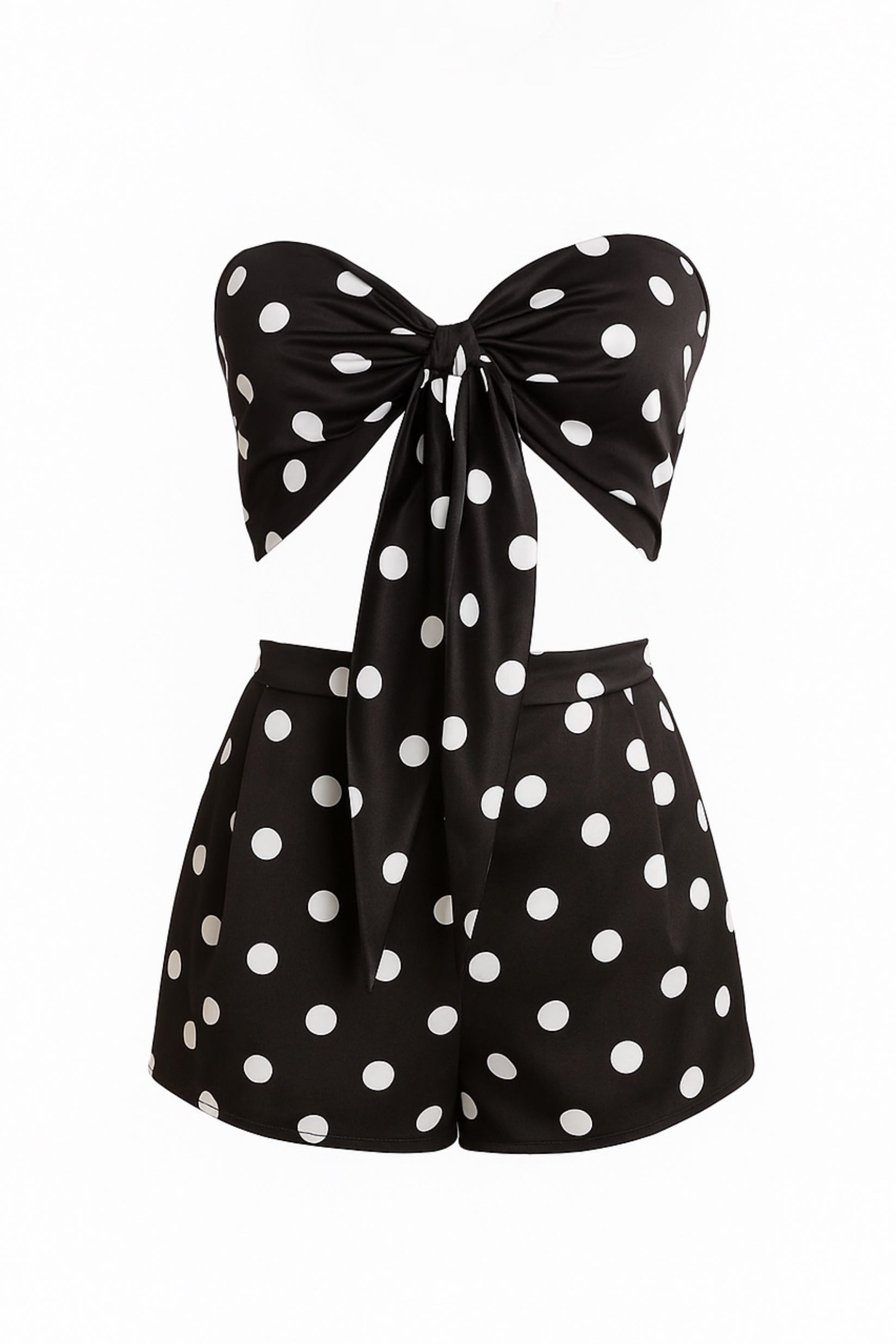 - Design: Bandaue style bralette with faux tie at front, paired with tailored shorts which are structured with waistband and side seam zip
